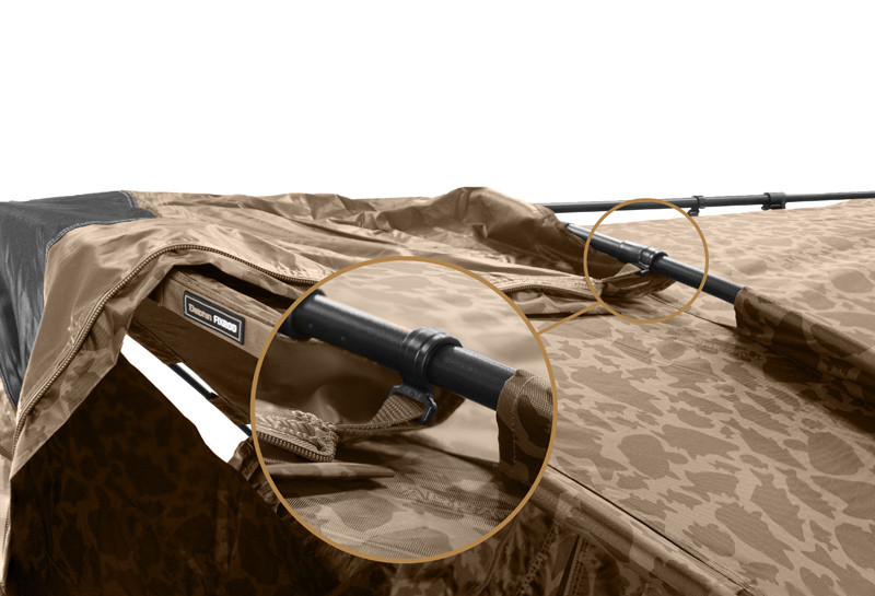 Bivak má v balení automaticky základnú podlahu, ktorá je fixovaná kvalitným zipsom po celom obvode bivaku. Odteraz nehrozia neželané návštevy hlodavcov, či nečistoty prenikajúce klasicky do bivakov pri uchytávaní suchými zipsami! Navyše je k bivaku možné dokúpiť hrubú gumovú podlahu.