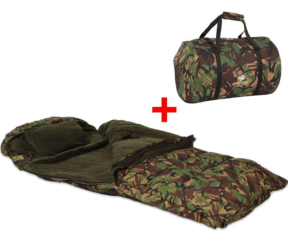 Ve vnitřní části spacího pytle, naleznete kapsu na zip, která je určena pro mobilní telefon, či doklady. Pod hlavou je na zip odnímatelný polštářek, který zajistí opravdový komfort. Na obou stranách spacího pytle (u hlavy a nohou) jsou ze spodu našité převleky, které se pouze přetáhnou přes vršek a spodek lehátka a zajistí tak neomezený a bezpečný pohyb. Ve střední části spacího pytle je popruh, který se díky přezce snadno upevní k lehátku a zabrání kroucení spacího pytle. Spací pytel je dodáván s přenosnou a zesílenou kompresní taškou v kamuflážovém provedení, jako samotný spací pytel.