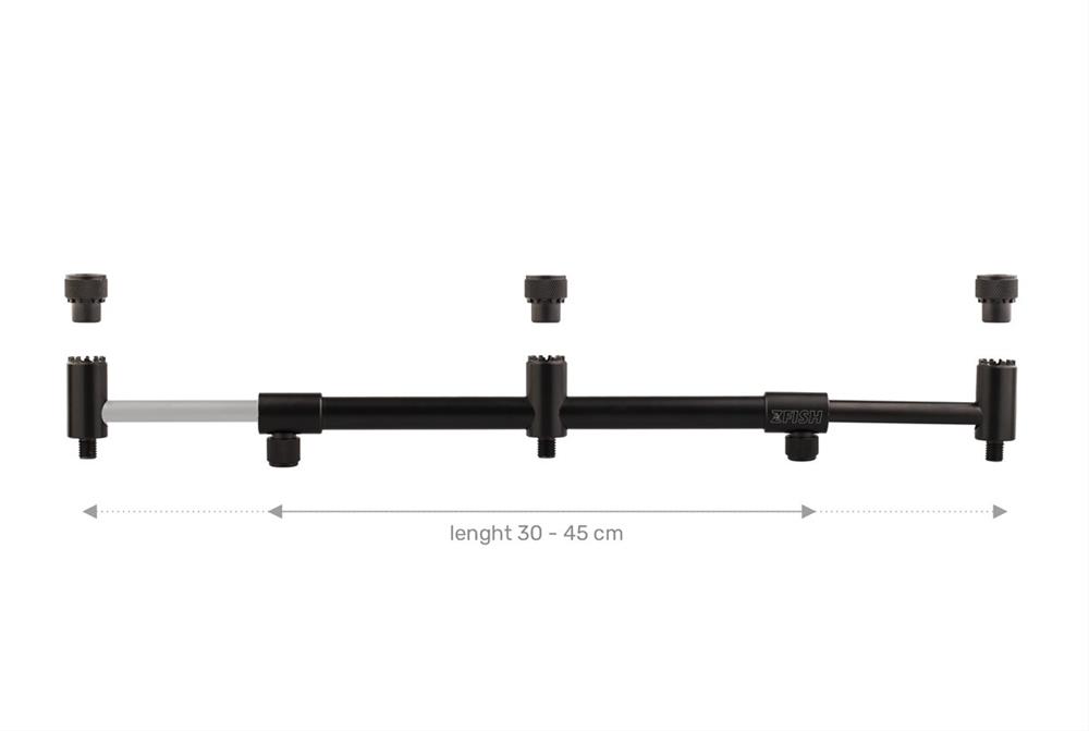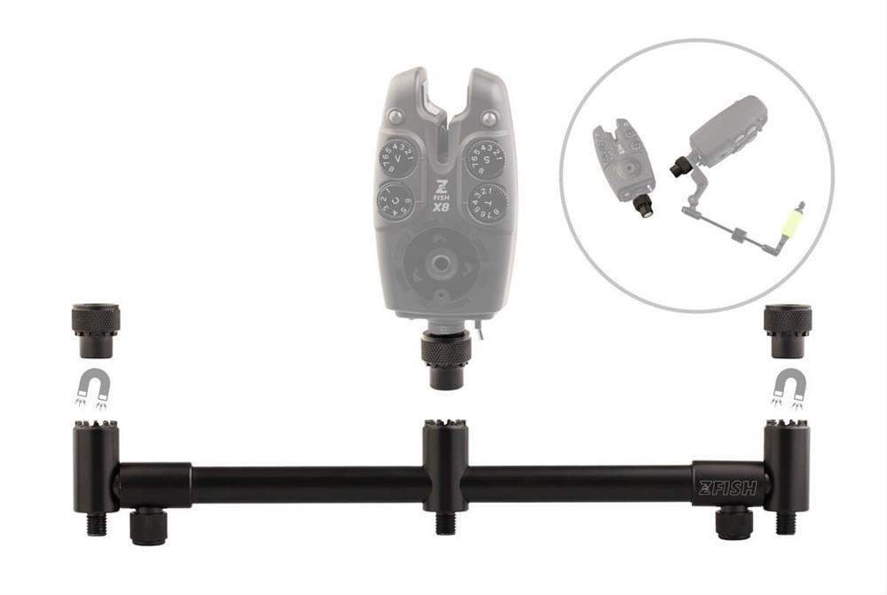 ZFISH Magsafe Buzzer Bar 3 Rods je velice precizně zpracovaná, kvalitní a pevná hliníková hrazda v černém matném provedení. Velkou výhodou této hrazdy jsou integrované magnetické adaptéry/rychlospojky k hlásičům, které Vám velice usnadní montáž a demontáž hlásičů. Další výhodou je teleskopicky nastavitelná šíře 31-45 cm a navíc hrazdu lze ukotvit k zemi pomocí jedné, dvou nebo tří závitových vidliček. Díky tomu již nepotřebujete žádný kotvící kříž a nemusíte mít obavy, že se vám hrazda bude protáčet při prudkém záběru.