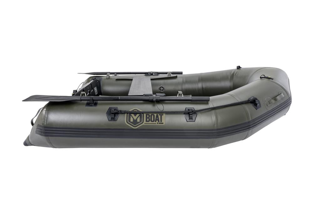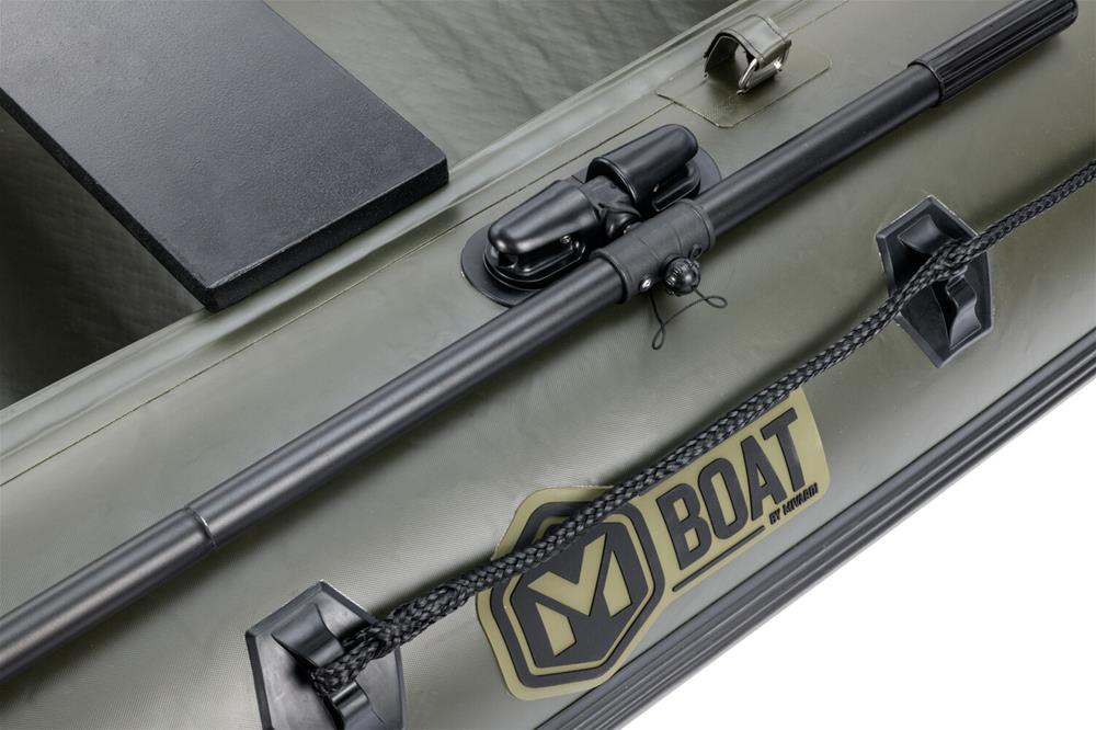Druhá generace nafukovacích člunů M-BOAT AWB, která zachovává všechny výhody a unikátní vlastnosti tohoto modelu a přidává řadu vylepšení. Nadstandardní šířka a specifický tvar člunu zajišťují extrémně velký vnitřní prostor. Ten je vždy výrazně větší než u běžných člunů stejné délky na trhu. Tomu napomáhá i specifické řešení zadní části plováků, které dovoluje umístit zrcadlo co nejblíže ke konci plováků a zároveň zachovat jejich funkci při udržování směru jízdy. Výrazně zdvihnutá příď spolu se speciálním tvarováním přední části, mohutným nafukovacím kýlem v celé délce podlahy a speciálně tvarovaným zrcadlem zajišťují vynikající hydrodynamické vlastnosti člunu a směrovou stabilitu. To v praxi znamená vyšší rychlost , snadnější ovládání a nižší spotřebu energie při pohonu člunu. Zesílený materiál plováků zvyšuje odolnost proti proražení. Nafukovací podlaha se zdvojenou nášlapnou vrstvou je téměř nezničitelná a její zelená barva skvěle ladí s se zbarvením člunu i černými vesly a ostatními doplňky. Každý člun je vybaven řadou upínacích pásků na suchý zip v přední části i na zrcadle. Najdeme zde i masivní upínací popruh na příslušenství ve střední části.