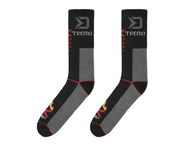 Dizajn ponožiek XTREMO je vytvorený kombináciou čiernej a sivej farby s oranžovou grafikou ohňa, červenými a bielymi prvkami doplnenými veľkým sivým logom Delphin.