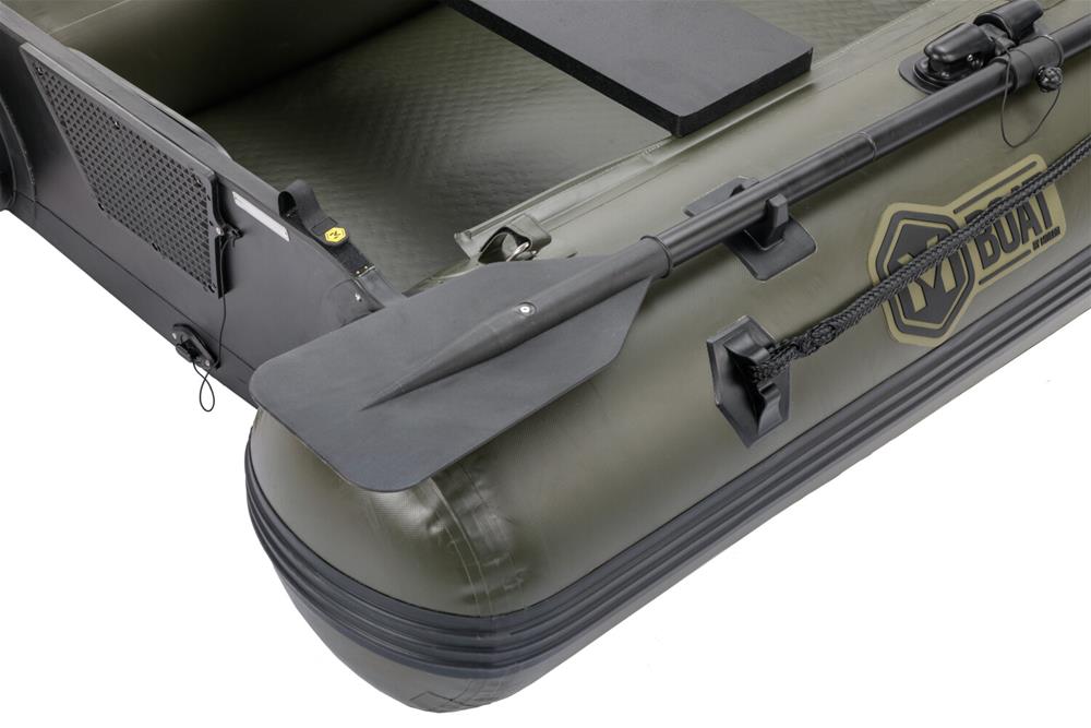 Druhá generace nafukovacích člunů M-BOAT AWB, která zachovává všechny výhody a unikátní vlastnosti tohoto modelu a přidává řadu vylepšení. Nadstandardní šířka a specifický tvar člunu zajišťují extrémně velký vnitřní prostor. Ten je vždy výrazně větší než u běžných člunů stejné délky na trhu. Tomu napomáhá i specifické řešení zadní části plováků, které dovoluje umístit zrcadlo co nejblíže ke konci plováků a zároveň zachovat jejich funkci při udržování směru jízdy. Výrazně zdvihnutá příď spolu se speciálním tvarováním přední části, mohutným nafukovacím kýlem v celé délce podlahy a speciálně tvarovaným zrcadlem zajišťují vynikající hydrodynamické vlastnosti člunu a směrovou stabilitu. To v praxi znamená vyšší rychlost , snadnější ovládání a nižší spotřebu energie při pohonu člunu. Zesílený materiál plováků zvyšuje odolnost proti proražení. Nafukovací podlaha se zdvojenou nášlapnou vrstvou je téměř nezničitelná a její zelená barva skvěle ladí s se zbarvením člunu i černými vesly a ostatními doplňky. Každý člun je vybaven řadou upínacích pásků na suchý zip v přední části i na zrcadle. Najdeme zde i masivní upínací popruh na příslušenství ve střední části.