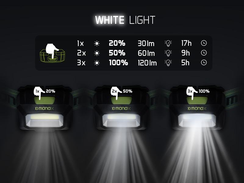 Biele svetlo ponúka tri režimy svietenia. Pri prvom kliknutí spínacieho tlačidla sa čelovka rozsvieti na 20 % svojej intenzity a v tomto režime vydrží svietiť až 17 hodín. Opätovné stlačenie spustí druhý režim s intenzitou 50 % a svietivosťou 60 lm, pričom výdrž batérie je 9 hodín. Tretím kliknutím sa aktivuje najsilnejší režim so 100 % intenzitou a výdržou 5 hodín. Dlhším podržaním tlačidla sa aktivuje zelené svetlo, ktoré má dva režimy. V prvom svieti na 100 % s výdržou 12 hodín, pričom pri ďalšom kliknutí sa intenzita zníži na 50 %, čím sa predĺži výdrž batérie až na neuveriteľných 40 hodín. Výhodou zeleného svetla je, že nepriťahuje otravný hmyz, čo oceníte najmä počas horúcich letných večerov.