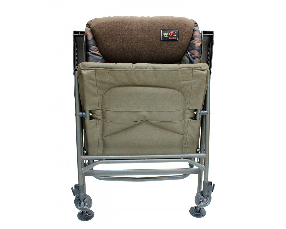 ZFISH představuje inovované křeslo Deluxe Camo Chair. Je to náš starý známý bestseller v novém kabátě. Jedná se o vylepšenou verzi Deluxe Chair v našem stylovém camo provedení. Použitím kvalitních materiálů jsme dosáhli snížení jeho hmotnosti při zachování pevné a stabilní konstrukce s nosností do 150 kg. Samozřejmostí je kvalitně polstrovaný sedák a opěrka z microfleece materiálu. Camo lemování je vyrobeno z voděodolného materiálu Ripstop. Křeslo vyniká vysokou opěrkou zad. Každý ocení polohovatelné područky, které umožňují až 8 různých poloh nastavení opěrky. Široké patky nohou zabraňují boření se v měkkém terénu a díky rychloklipům je nastavení polohovatelných nožiček hračkou. Toto křeslo poskytuje maximální komfort nejen rybářům, ale všem, kteří rádi tráví čas pohodlným posezením v přírodě.