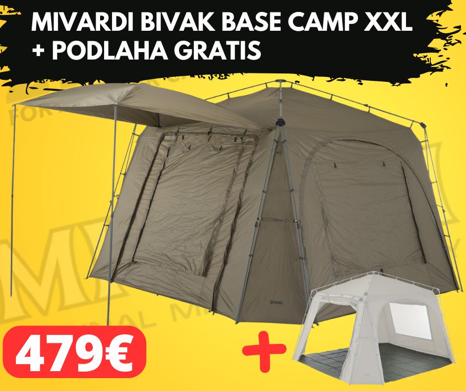 Plášť z materiálu M-TEC300 s hexagonální texturou disponuje vodním sloupcem 8000mm a zvýšenou mechanickou odolností. Na zadní stěně se nachází velké okno s moskytiérou a nylonovým pláštěm, vybavené funkcí mikroventilace při použití rozpěry ve spodní části okna. Přední stěna je tvořena otevíratelným vchodovým panelem s obrovským oknem, osazeným moskytiérou, transparentním PVC a nylonovým pláštěm. Přední panel typu letter box lze otevřít po stranách a klasicky srolovat nahoru nebo jej částečně rozepnout a otevírat postupně shora dolů. V přední části přístřešku se nachází velká markýza s vlastní sklolaminátovou konstrukcí. Při rozložení je podepřena dvěma stojnami a zajištěna kotvícími lanky. Markýzu je možné kompletně sklopit podél přední stěny přístřešku a není ji třeba vždy rozebírat. Speciálně řešené napojení markýzy na přístřešek účinně brání hromadění vody na střeše i při prudkém dešti. Boční stěny přístřešku jsou vybaveny velkými otevíratelnými okny s nylonovým pláštěm a moskytiérou s funkcí mikroventlilace. Boční panely typu letter box je rovněž možné částečně otevřít či úplně odepnout. Unikátním prvkem přístřešku Mivardi Base Camp je samostatně dostupná sada pro napojení bivaků. Jedná se o dvě univerzální boční manžety, které lze připevnit k přístřešku Base Camp místo odepnutých bočnic. Tyto manžety pak slouží ke snadnému napojení téměř libovolného bivaku či brolly na přístřešek Base Camp. Mezi další samostatně dostupné příslušenství patří sada čtyř vnitřních závěsných organizérů nebo masivní odolná podlaha. Přístřešek je standardně dodáván v dostatečně velké transportní tašce pro snadné uložení sbaleného přístřešku. Tato taška z nylonu 600D je nepromokavá a omyvatelná.