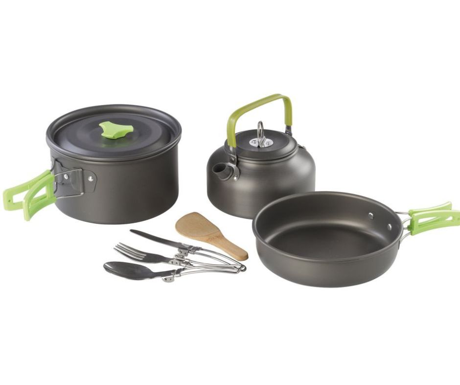 • 3 dielny set riadu s elexovanou povrchovou úpravou, 2 skladacie nerezové príbory a drevená vareška.
