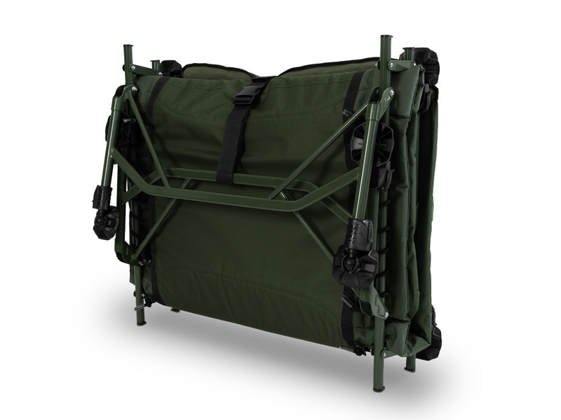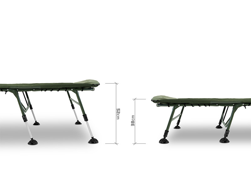 Lehátko je postavené na pevnej kovovej konštrukcii s vysokou nosnosťou, ktorá napriek svojej odolnosti zostáva ľahká a jednoducho prenosná. Na konštrukcii sa nachádza osem výškovo nastaviteľných nôh, ktoré je možné vysunúť až do výšky 52 cm. Každá noha je vybavená širokou flexibilnou pätkou, ktorá účinne zabraňuje zabáraniu do mäkkej pôdy a zaisťuje stabilitu aj na nerovnom povrchu. Pár nôh pod hlavou je navyše opatrený zaisťovacím mechanizmom, čo uľahčuje rozloženie lehátka a zároveň zabraňuje neželanému sklápaniu, či posunu.