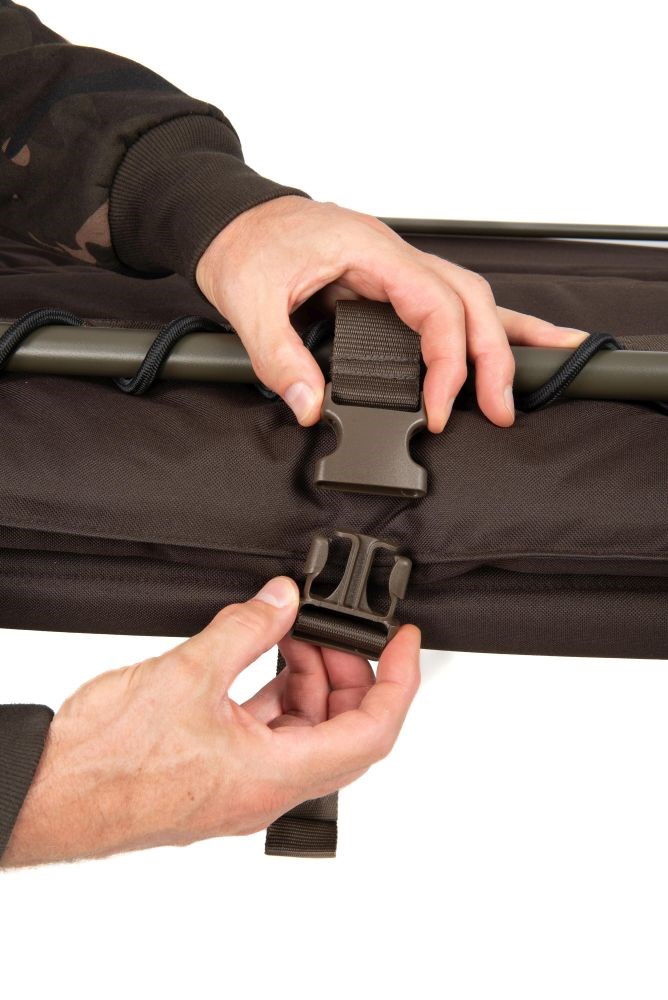 Praktický systém popruhov a praciek umožňuje lehátko kompaktne zložiť, a to aj so spacím vakom pripevneným k lehátku.